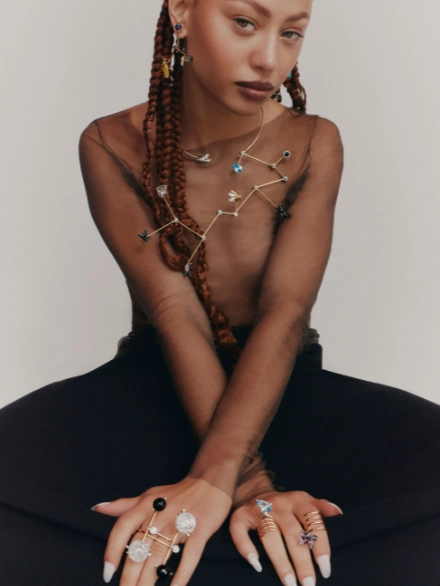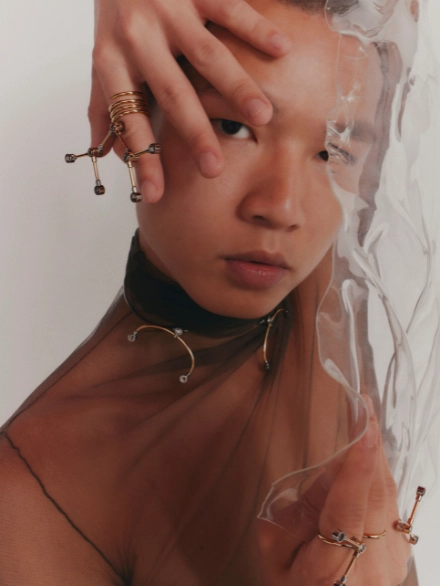 Un anillo de oro blanco de 18 quilates con diamantes éticos, un pendiente de oro rosa con diamantes, un brazalete unisex en oro amarillo de 18K… combinaciones imposibles que crean nuevas referencias.