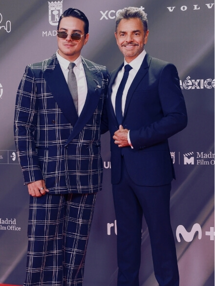 Father and son, Eugenio and Vadhir Derbez, shared the spotlight with the same choice of style: a white gold brooch featuring the Big Fly in black gold, fully pavé-set with black diamonds by ECH Jewelry.