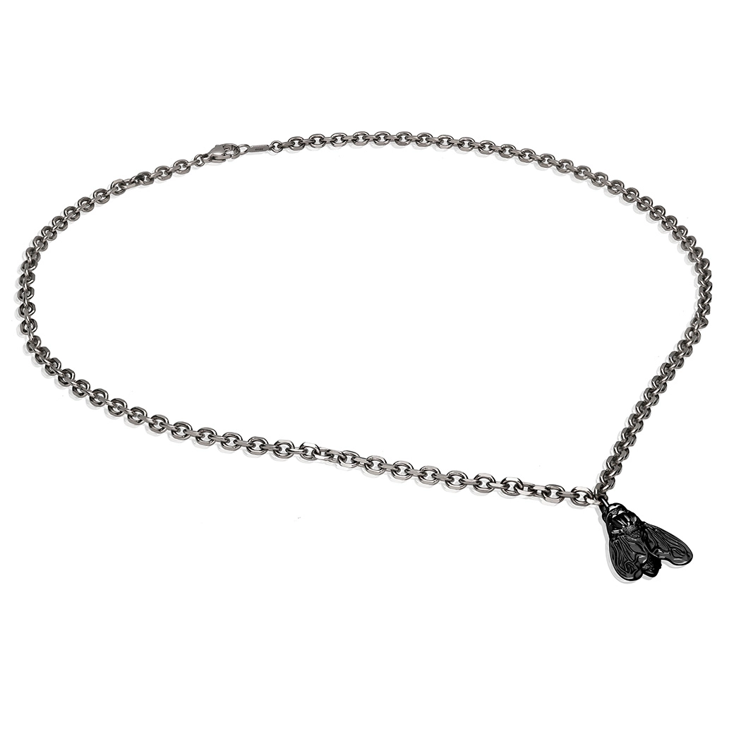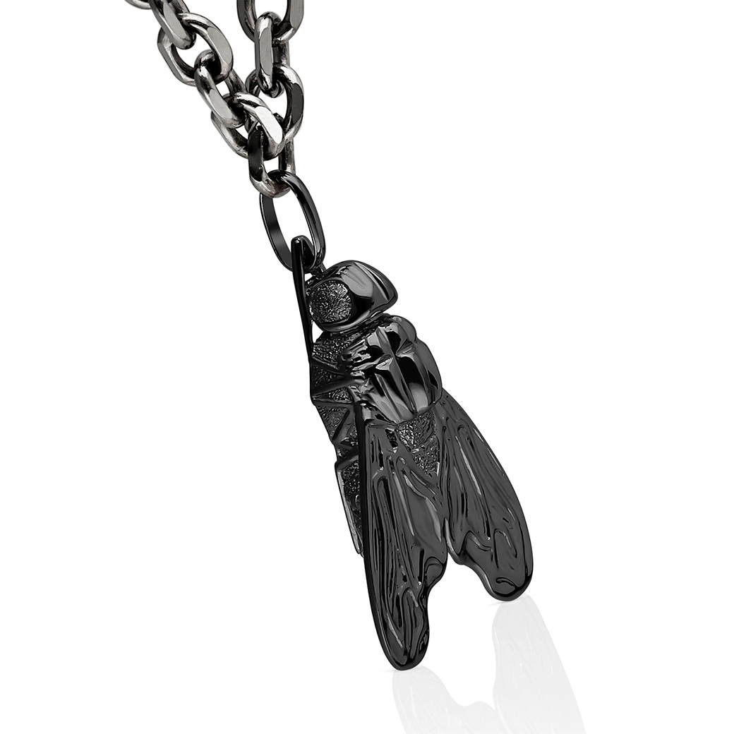 A central Big Fly motif in black gold, measuring 15 × 24 mm, paired with a wide-link titanium chain (3.8 mm · 50 cm), robust and well-balanced.