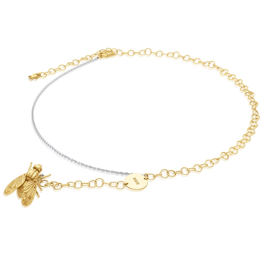 BigFly Necklace crafted in 18k yellow gold and 18k white gold, featuring a suspended Big Fly motif in yellow gold, held by a double-chain composition. A contemporary high jewelry necklace with an iconic design and sculptural presence. This piece belongs to the BigFly collection, where the fly becomes a central symbol of identity, tension, and a contemporary gaze. Part of the BigFly Necklace line, conceived to give absolute prominence to the Big Fly motif and its relationship with the body. You and your symbol take center stage.