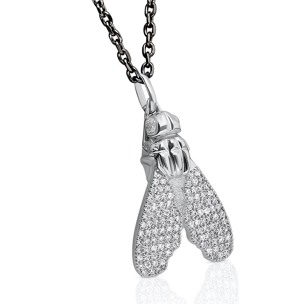 A central Big Fly motif in white gold, measuring 15 × 24 mm, with a full pavé of ethical brilliant-cut diamonds arranged to envelop the motif in a homogeneous, defined radiance. A titanium chain, 1.8 mm and 42 cm, light and precise, designed to underline the sharpness of the pavé.