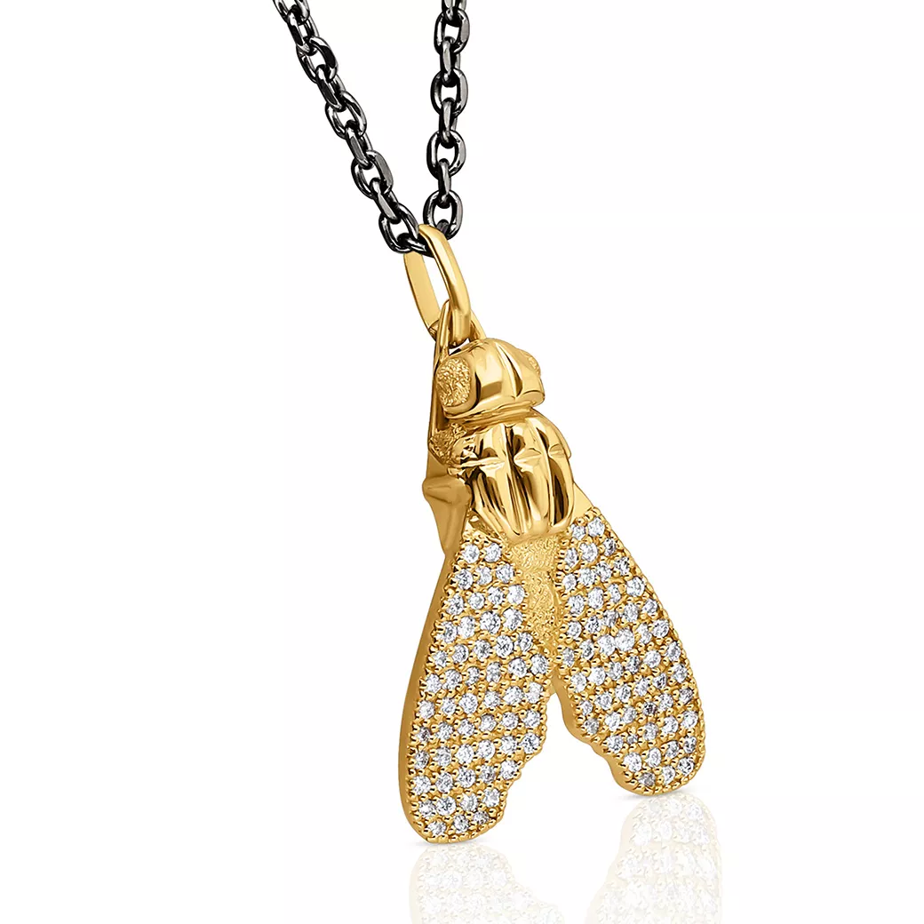 A central Big Fly motif in yellow gold, measuring 15 × 24 mm, with a full setting of ethical brilliant-cut diamonds arranged to cover every surface with continuous, uniform radiance. A titanium chain of 1.8 mm and 42 cm — light and technical — designed to balance the motif’s integral pavé.