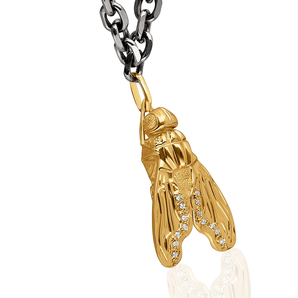 A central Big Fly motif in yellow gold, measuring 15 × 24 mm, with strategic touches of ethical brilliant-cut diamonds and a wide-link titanium chain (3.8 mm · 50 cm).