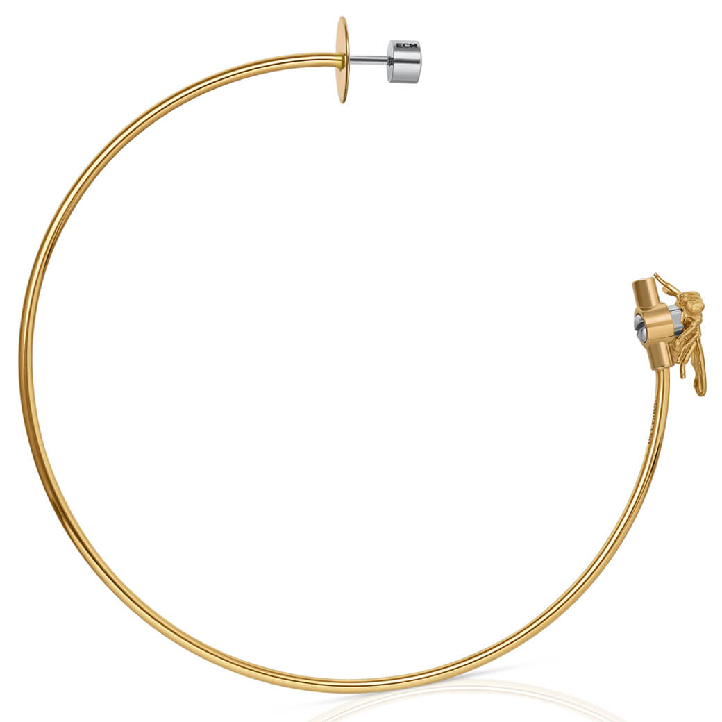 A single yellow gold earring featuring the central symbol — the Fly, sculpted in the same 18K gold — that concentrates detail, gesture, and meaning. It is held on a 90 mm yellow gold hoop with a screw back and wide disc, ensuring secure and comfortable wear.