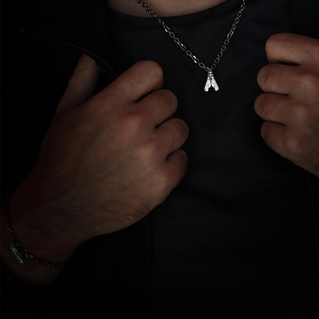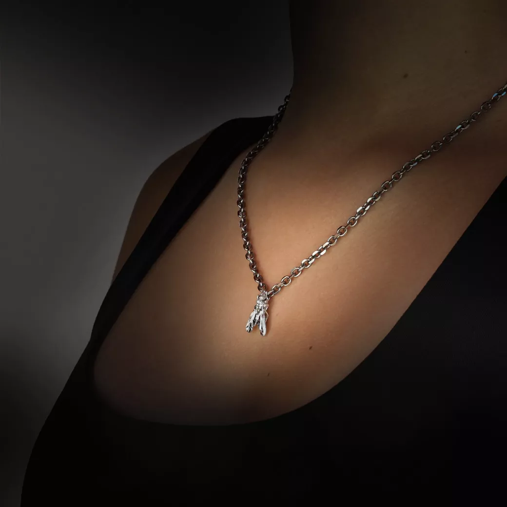 Motif of 18 mm in 18K white gold, crafted with hyperreal precision. Titanium chain of 3.8 mm and 50 cm, robust and sculptural.