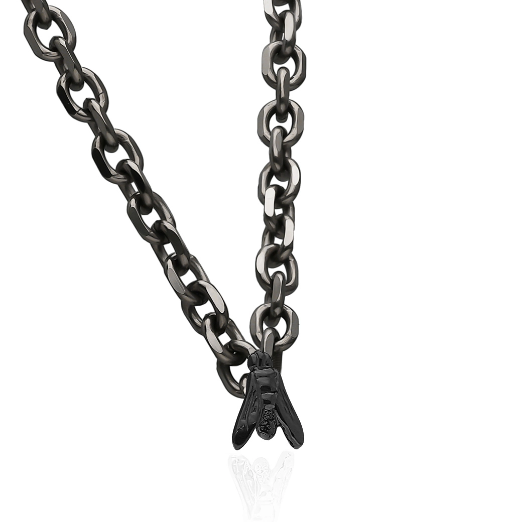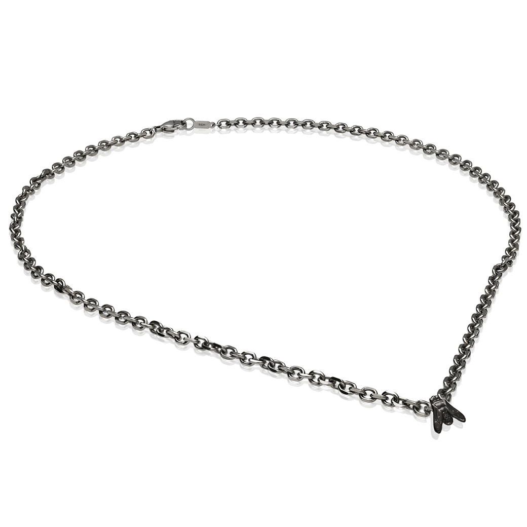 This black gold necklace, unisex and refined, gains strength through the light power of titanium, which redefines the fall and balances the motif. Part of the Essential collection. miniFLY in its more voluminous version.