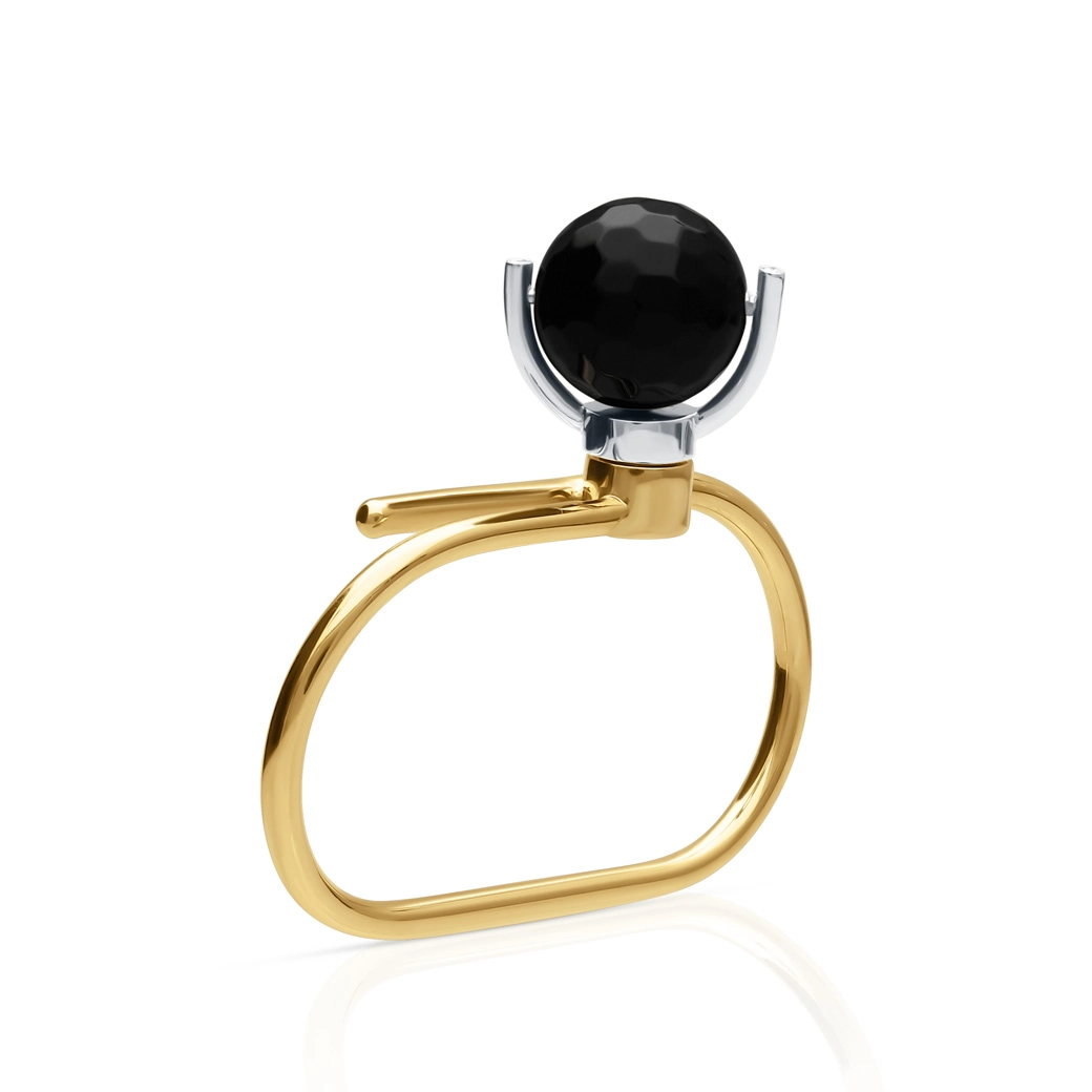 Double finger ring in 18K yellow gold with onyx in a faceted sphere and two diamonds set in stitch setting. A piece of contemporary high jewelry by ECH, part of the Limited Edition line. This yellow gold ring belongs to the brand’s contemporary universe, where volume and proportion define the jewel and presence is built through control.