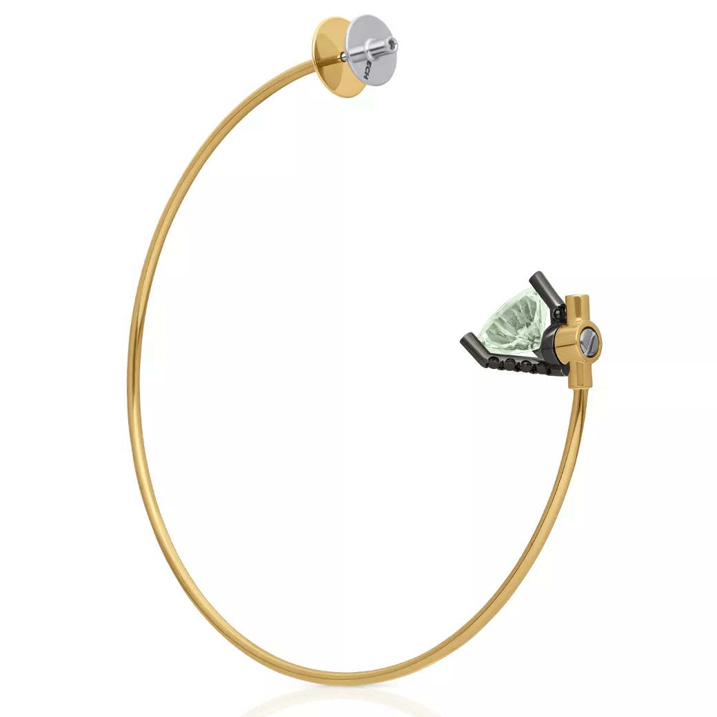 Prasiolite, associated with growth, renewal, and balance, introduces a serene interpretation of color. Black diamonds add depth and character, establishing a restrained dialogue between light and shadow that reinforces the sculptural presence of the yellow gold earring. 18k yellow gold enhances the trillion-cut prasiolite, bringing warmth and structural solidity to the composition, while intensifying both the stone’s chromatic softness and the visual strength of the black diamonds. The black diamonds act as visual anchors, adding density, contrast, and a contemporary reading of light. Renewal. Balance. Sculptural art. GEMS Collection · ECH