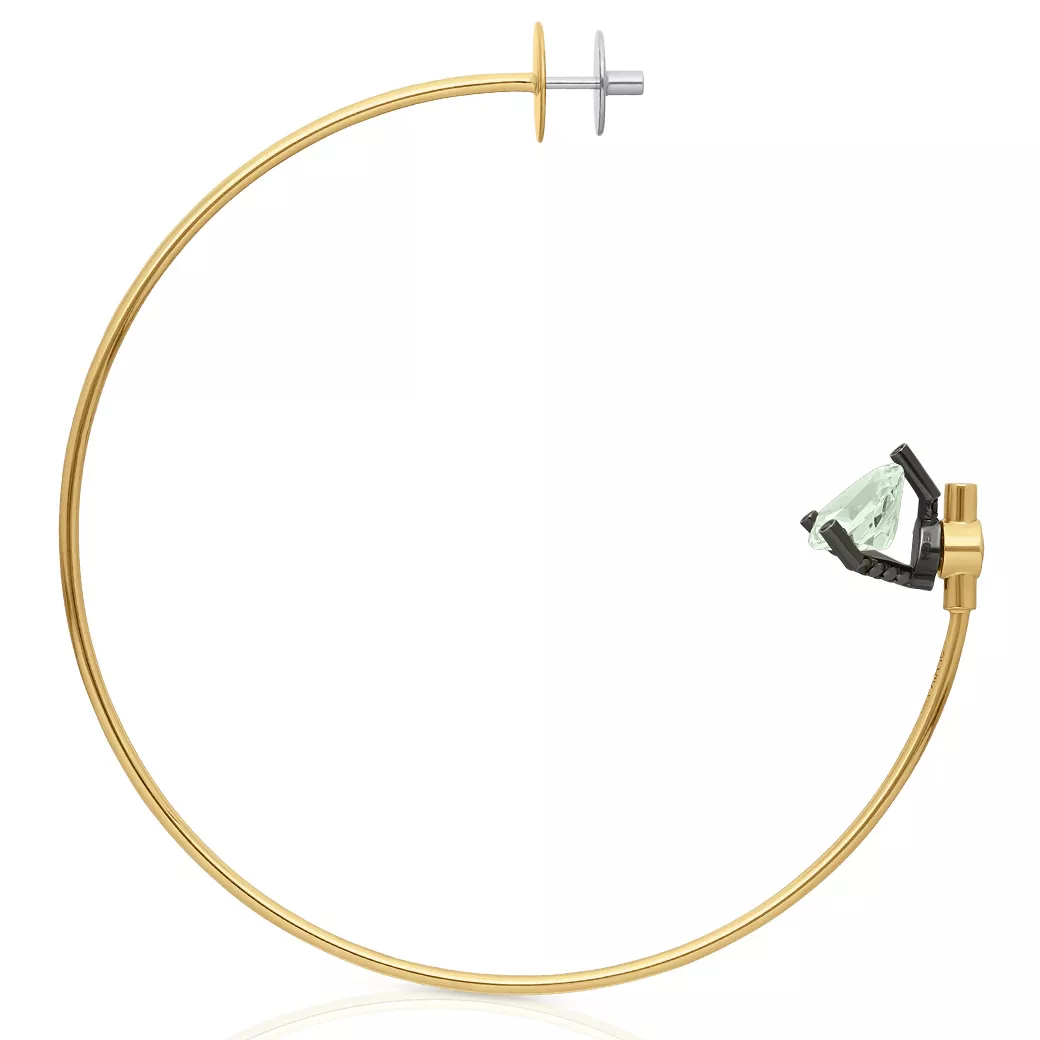 Single Earring in a Large hoop design, crafted in 18k yellow gold, featuring a sculptural trillion-cut prasiolite and black diamonds. A gold hoop earring that brings together sculptural form, color, and contrast. A piece of contemporary High Jewelry from the GEMS Collection by ECH. The GEMS Collection places the gemstone at the center of the design, elevated to reveal its identity and its relationship with light. Large hoop earring with a 90 mm diameter, featuring prasiolite as the central sculptural element.