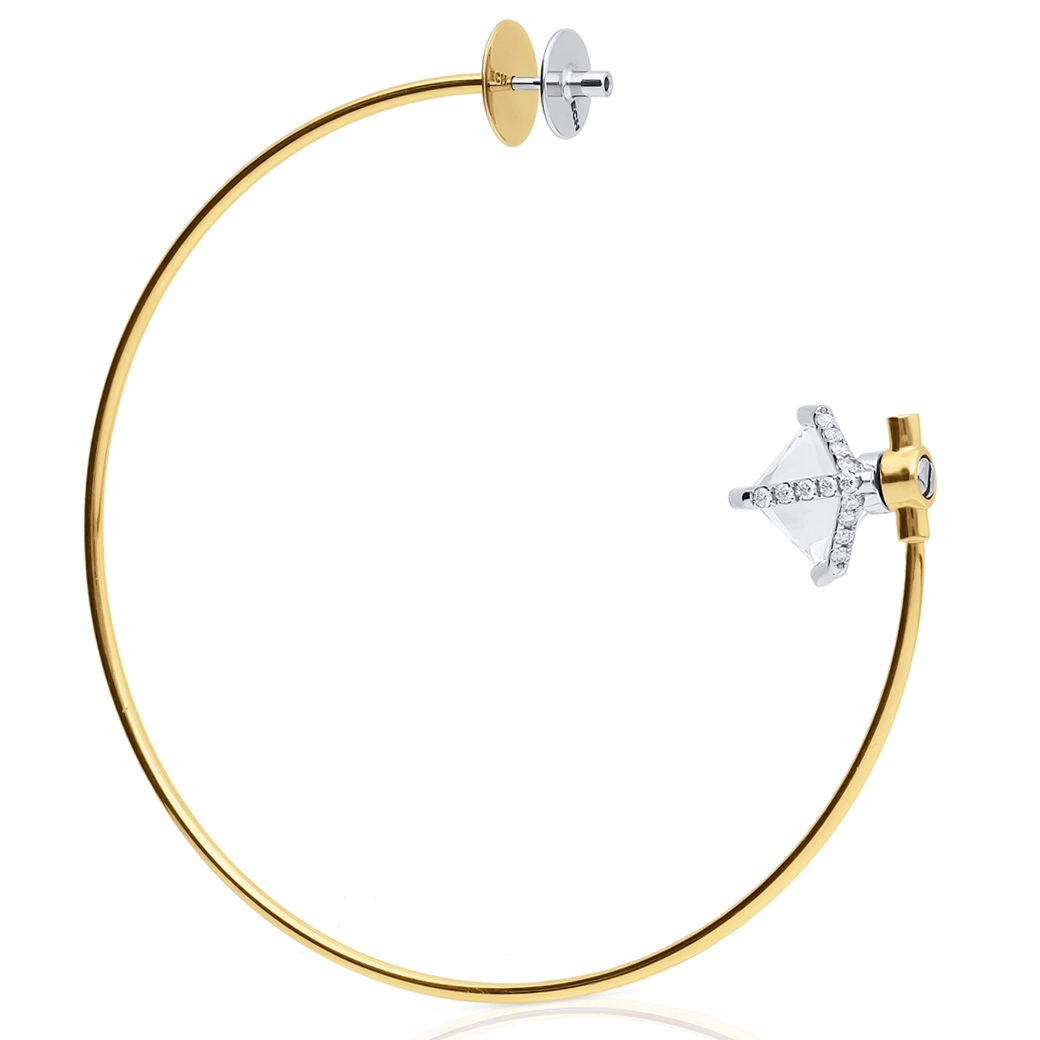 Hoop in 18K yellow gold with a 90 mm diameter, featuring rock crystal in a princess cut and diamonds, supported by a structure in 18K white gold. A piece of contemporary high jewelry by ECH, GEMS Collection, Limited Edition line. GEMS Collection, where the stone takes precedence and light becomes a visual language. The Limited Edition line is conceived as an exclusive series centered on exceptional gemstones.