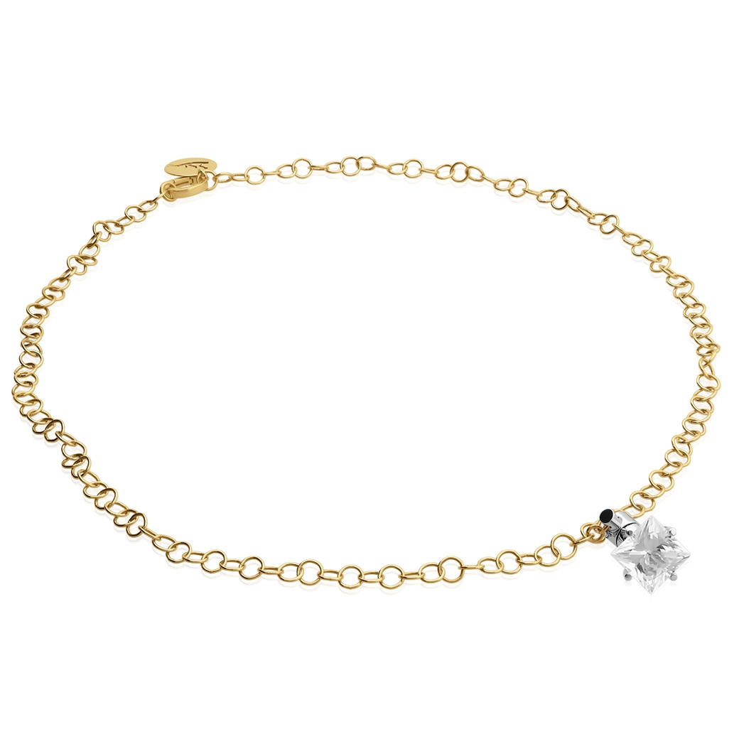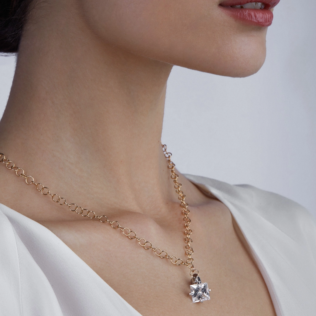 Central rock crystal in a princess cut, with a frontal reading and straight facets. Necklace with bold links in yellow gold, designed for a firm and balanced fall on the chest. Transparency is an attitude.