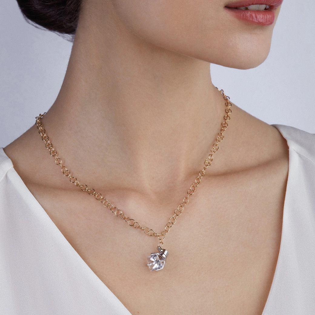 This necklace works through clarity: a defined presence that organizes the gaze through the geometry of the stone. Yellow gold adds warmth and depth; white gold frames the stone with precision and allows light to pass freely through the rock crystal. Clarity, structure, and focus. In the GEMS Collection, ECH elevates the stone into a visual experience; in Limited Edition, each piece asserts itself as a conscious choice.