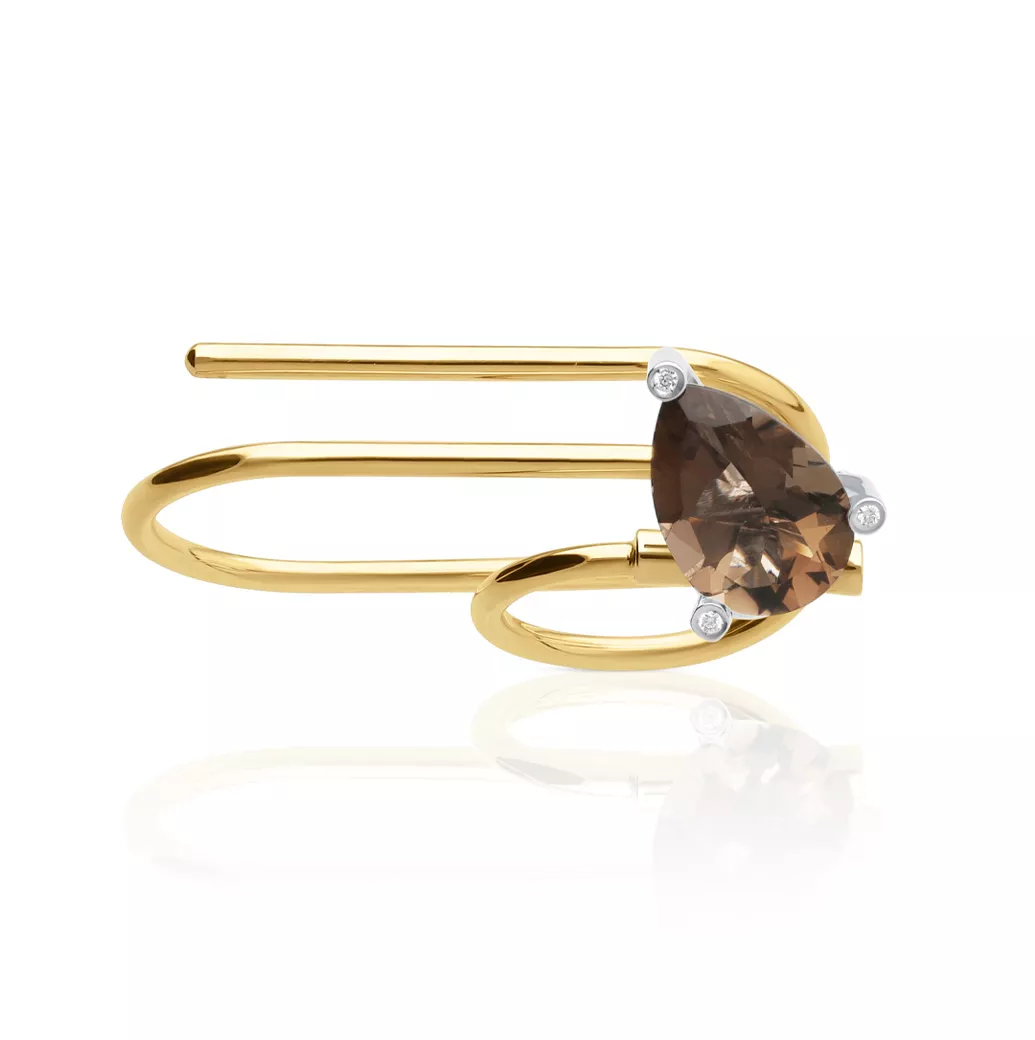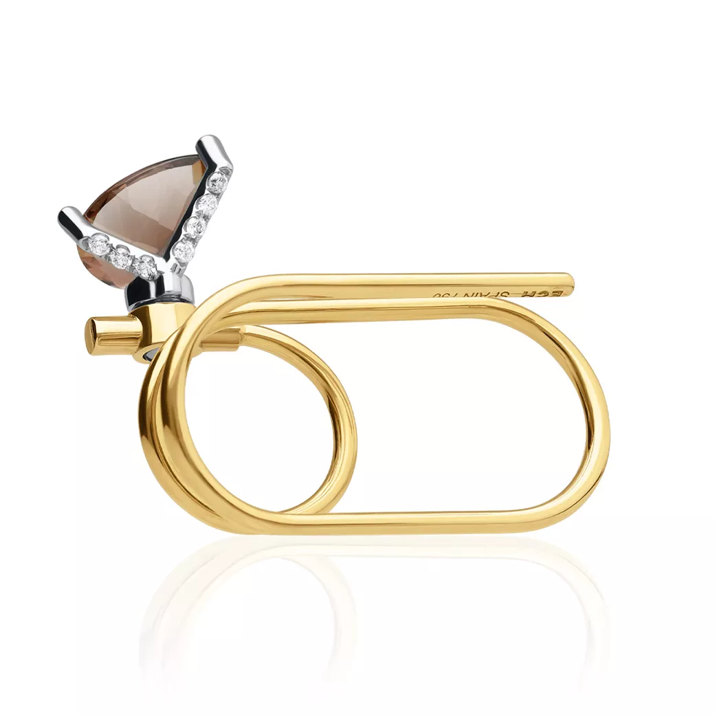Double finger ring in 18K yellow gold with smoked quartz in pear cut and diamonds. A piece of contemporary high jewelry by ECH, part of the Limited Edition line. This yellow gold ring translates structural design into a deeper, more sophisticated register, where mystery becomes form.