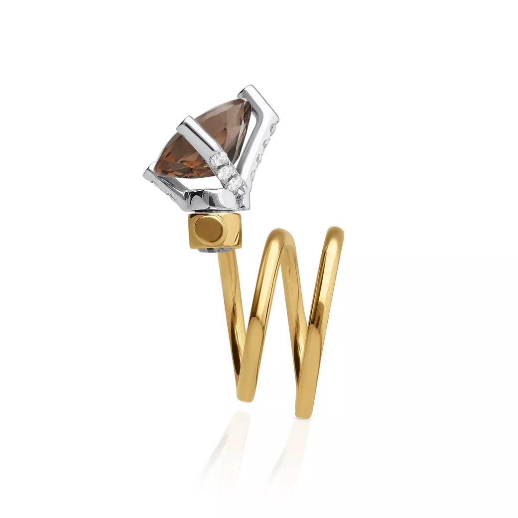 The pear-cut smoked quartz acts as a directional axis wrapped in veiled light. Its smoky tone does not seek to dominate, but to attract with discretion, bringing a sense of elegant depth. The set diamonds appear as restrained points of light, marking the path of the design and reinforcing the architecture with precision. The double finger ring structure maintains a continuous gesture that follows the natural movement of the hand with stability and comfort.