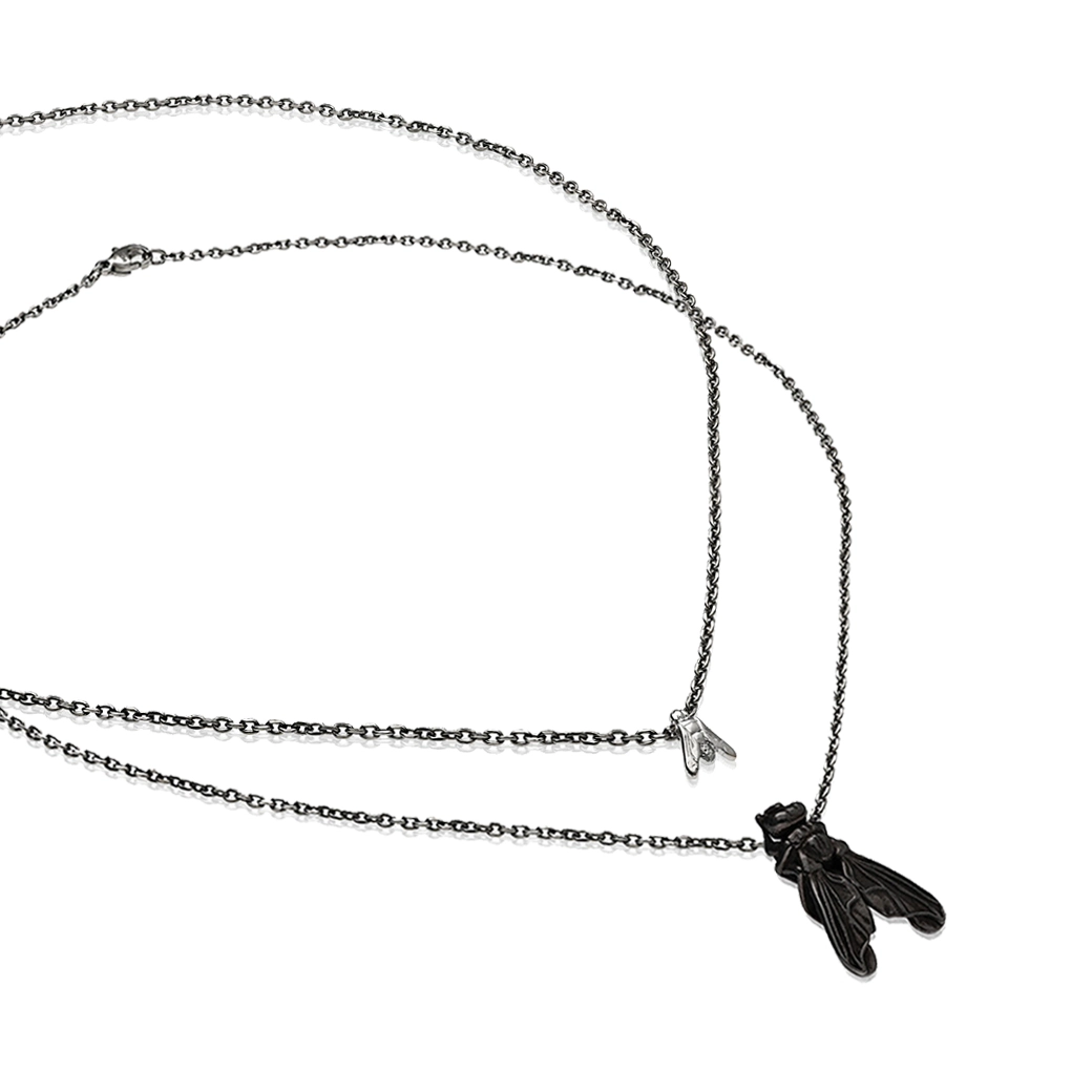 A set of gold necklaces by ECH Jewelry, composed of a miniFLY Essential necklace in 18-carat white gold and a Fly Classique necklace in 18-carat black gold, both suspended from a titanium chain. A refined proposal of designer necklaces and contemporary jewelry, conceived to be shared or layered, where the symbol is expressed through two complementary identities of the brand.
