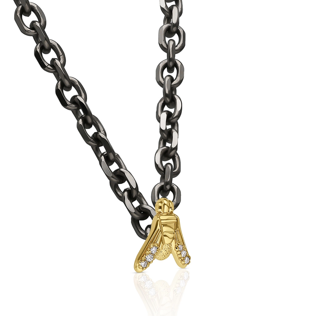 This yellow gold necklace with diamonds, unisex and assertive, gains presence through the strength of a bold titanium chain that amplifies its impact. Essential: identity without explanations. midiFLY in its most direct and luminous form.