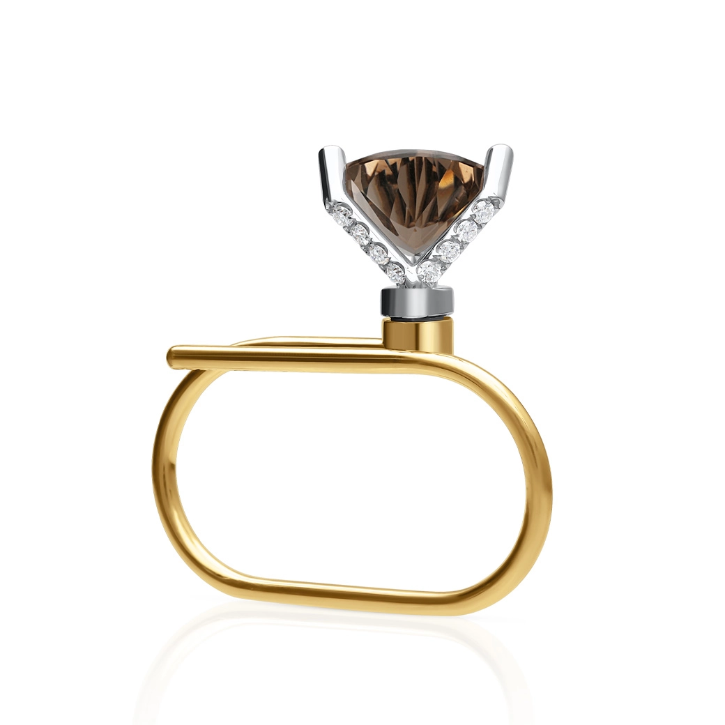 Form flows. Mystery remains. This double finger ring turns geometry into an elegant, continuous gesture. The 18K yellow gold adds warmth and contrast, while the trillion-cut smoky quartz introduces depth and character. The diamonds deliver controlled fire, reinforcing the overall elegance without breaking its balance.
