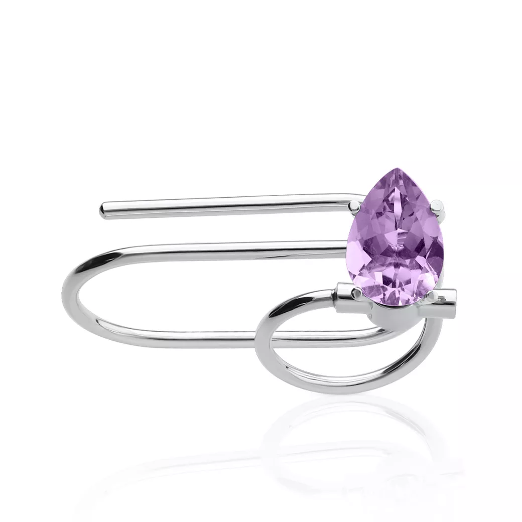 La amatista pink central aporta un punto de color sereno, de lectura frontal limpia y proporción equilibrada. La estructura de anillo de dos dedos reparte el peso y acompaña el movimiento natural de la mano con estabilidad y confort, reforzando la presencia del gesto sin imponerse.