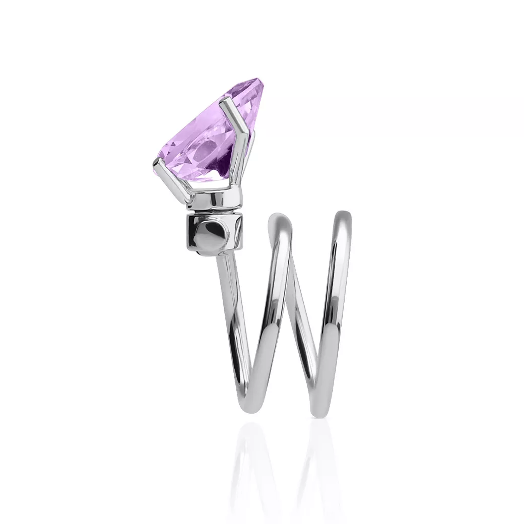 La precisión también puede emocionar. Este anillo de dos dedos convierte la arquitectura en un gesto sereno: la doble sujeción amplía la superficie visual y permite que el color se exprese con naturalidad. El oro blanco de 18K aporta claridad, sobriedad y rigor, enmarcando la amatista pink y realzando su tono suave y luminoso.