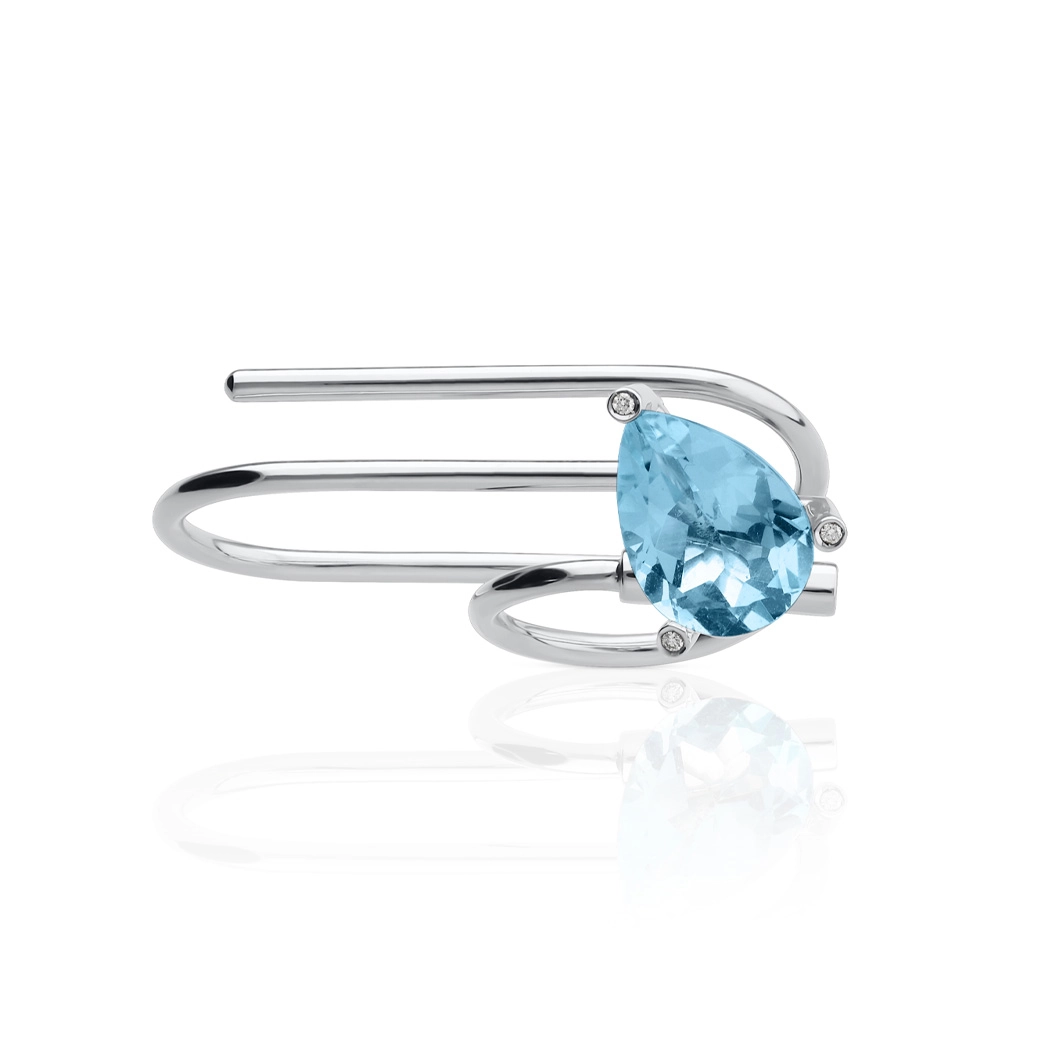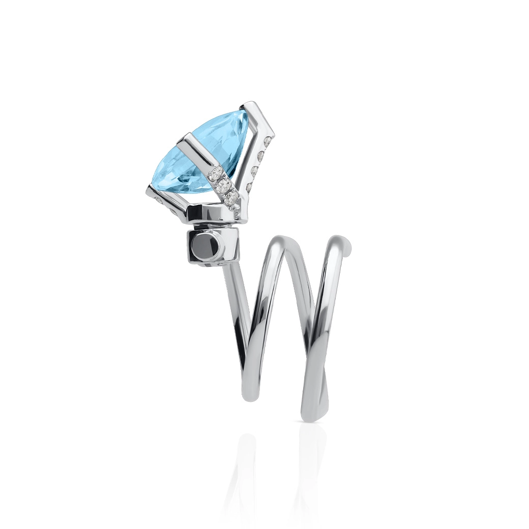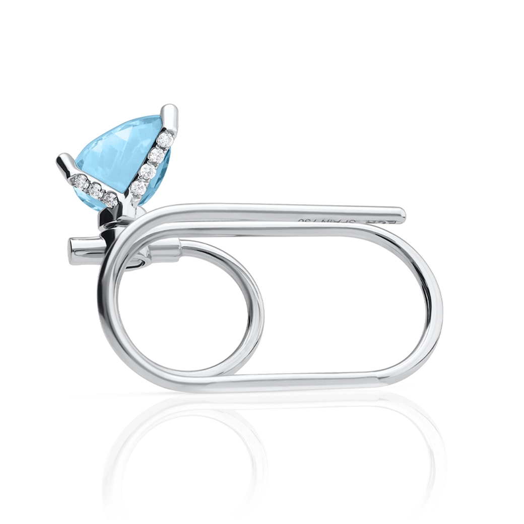 La forma guía la luz. Este anillo de dos dedos se construye como una línea en avance: une ambos dedos en un solo gesto fluido, donde la piedra marca la dirección y el conjunto se percibe ligero y exacto. El oro blanco de 18K aporta claridad y rigor, reforzando la lectura técnica y contemporánea del diseño. Los diamantes actúan como acentos funcionales, ordenando el volumen sin restar protagonismo al topacio.