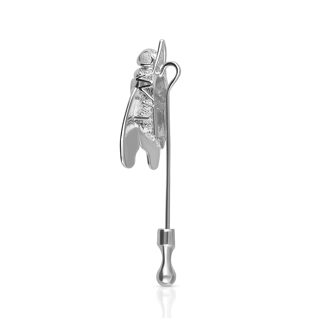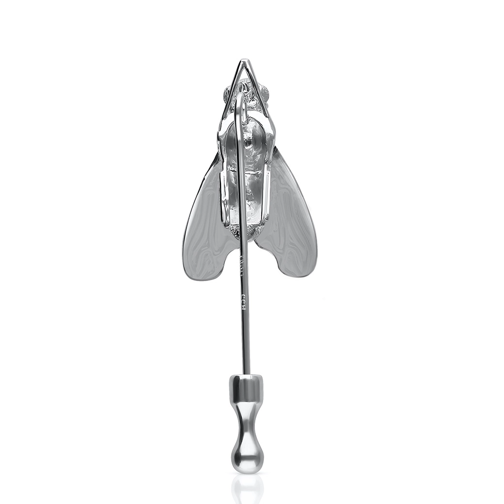 Un motivo central, Big Fly de oro blanco de 15 × 24 mm. Cierre de aguja con sistema de presión, sólido y preciso.