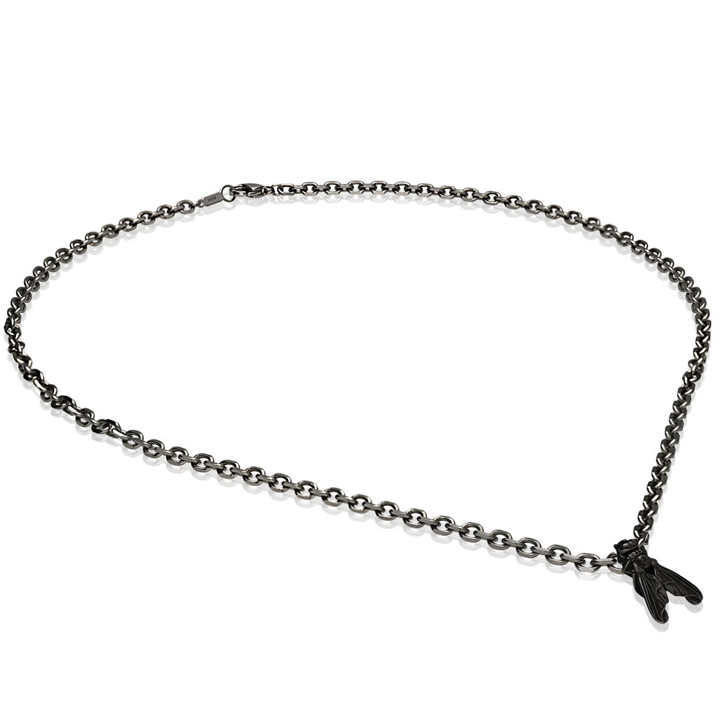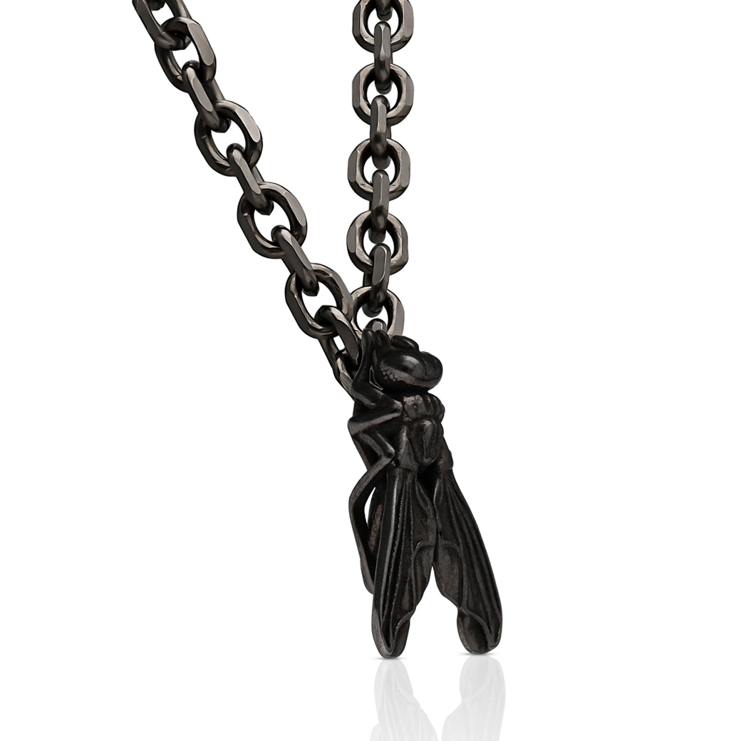 Motivo de 18 mm en oro negro de 18 quilates, pulido con realismo. Cadena de titanio de 3.8 mm y 50 cm, robusta y escultórica.