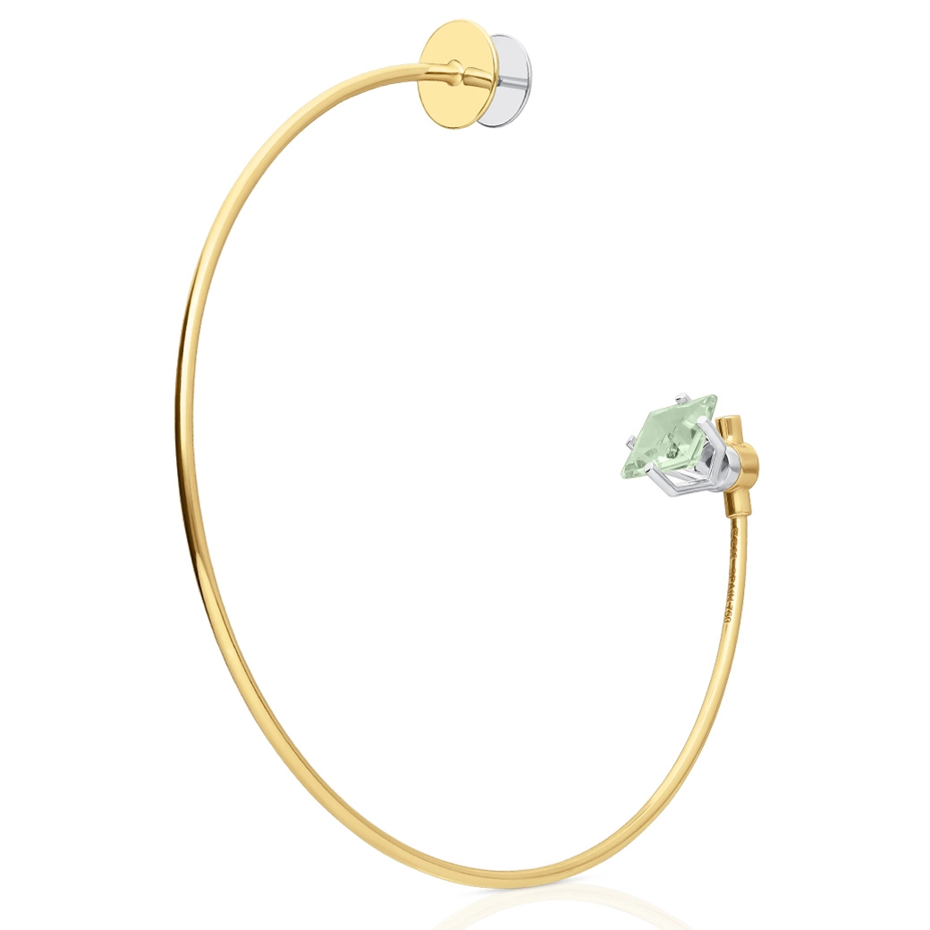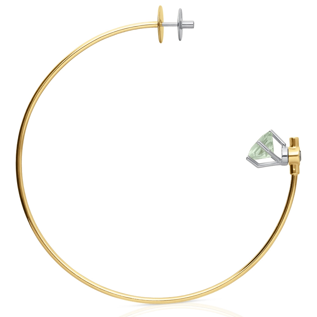 Pendiente Individual hoop Large de 90 mm en oro amarillo de 18 quilates con trillón de prasiolita escultórica. Un pendiente de aro en oro amarillo de 18K donde la gema se integra como centro expresivo, pieza de Alta Joyería contemporánea de la GEMS Collection de ECH. La colección concibe la gema como núcleo del diseño: materia natural elevada para revelar su identidad, su energía y su relación con la luz.